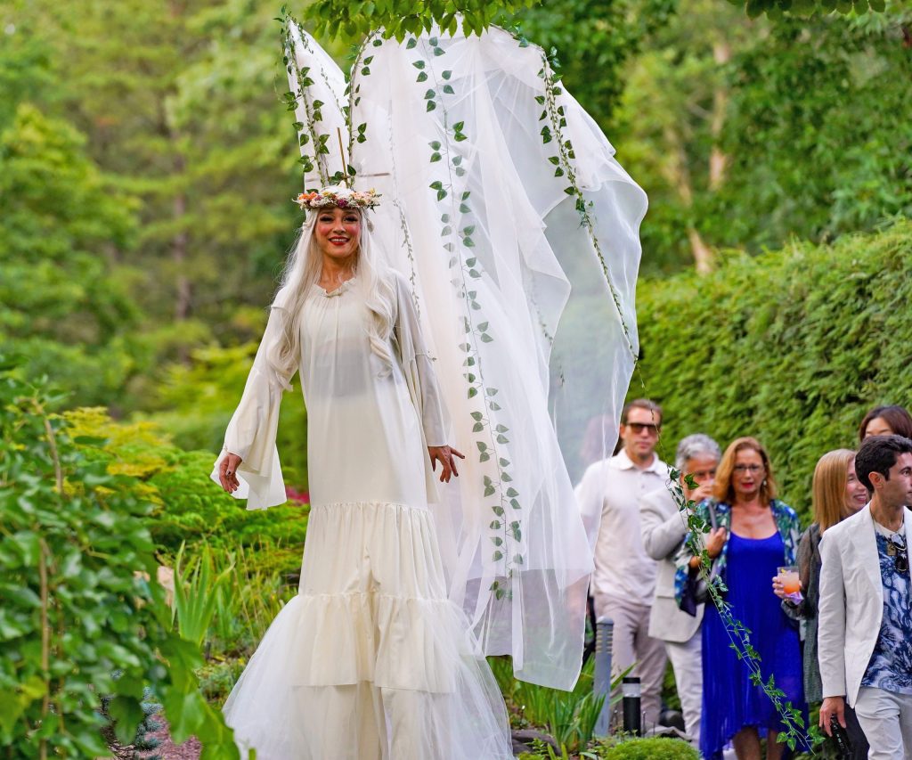 LongHouse Reserve celebrated its annual Summer Benefit honoring the joyful creativity of artist Mary Heilmann and the literary genius of A. M. Homes. Gala Chairs Dianne Benson, Cindy Sherman, and Robert Wilson, Art Chairs Pamela Willoughby and George Negroponte, with LongHouse Board of Trustees, greeted friends and supporters – including Alice Aycock, Candace Bushnell, Rosanne Cash, Renee Cox, Bill T. Jones, Laurie Lambrecht, Sophie Chahinian and Robert Longo, Lisa Perry, and G.E. Smith – to the MidSummer Dream themed evening, full of wonder. Guests entered through the sand dunes, into a whimsical world with pop-up performances including stilt walkers, musicians, dancers, a horse rider, a merman in the pool, trapeze aerialists and acrobats roaming the gardens, enhancing the sensual space that is LongHouse. The entire 16-acre grounds were open to discovery with art at every turn, including this new works by Wyatt Kahn and Fitzhugh Karol (both in attendance), loans from Daniel Arsham and Ai Weiwei, as well as permanent works by Buckminster Fuller, Sol LeWitt, Yoko Ono and more. The evening raised over $650,000.