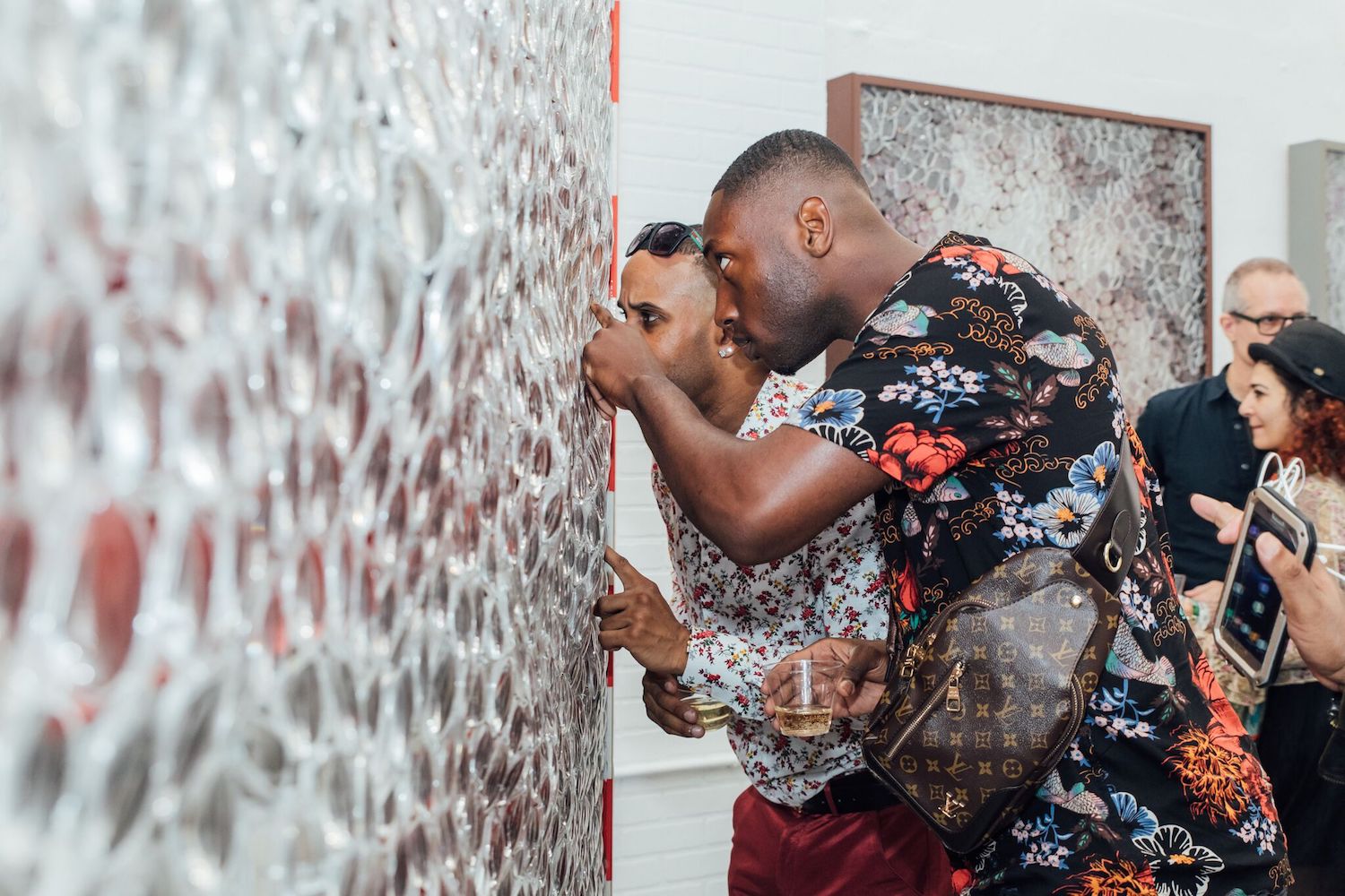 Guests examining Datuna’s Use of Smart Glass Technology in his art (Anastasiia Davydova)