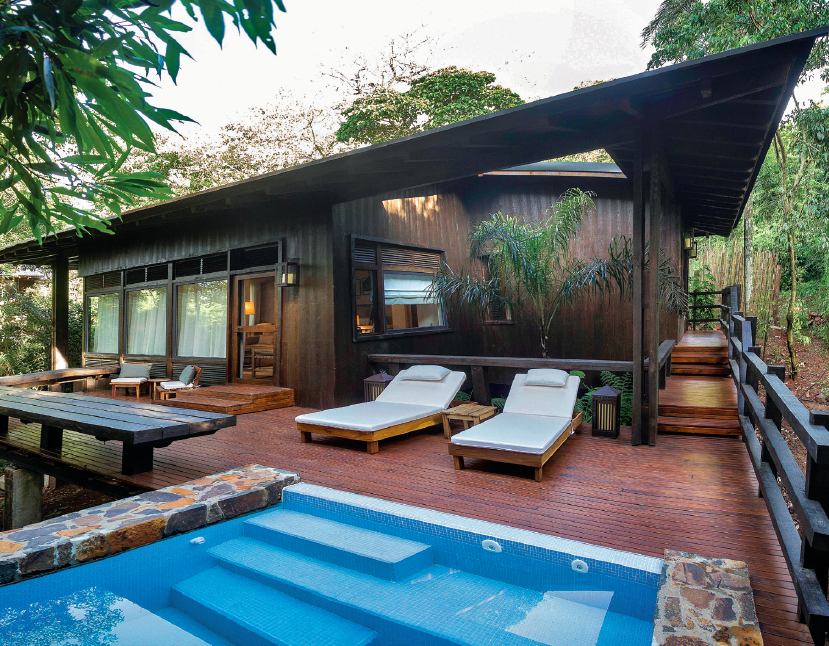 Next up: an overview of your private villa. While the ambient sounds of the rainforest remind you that you’re indeed isolated and smack in the jungle, the villa provides a safe and civilized oasis. The villas are spotless, well appointed, and environmentally appropriate. The open-concept villas are spacious. A villa’s living room area contains an overstuffed couch and chairs; its sleeping area has a dreamy bed dressed in sumptuous linens. The villas are decorated with plenty of indigenous art to admire. A separate bathroom features everything you’d expect from a five-star property, including exceptional bath amenities. The pièce d’résistance is the private deck and plunge pool where you enjoy the sights and sounds of nature without seeing or hearing other guests.