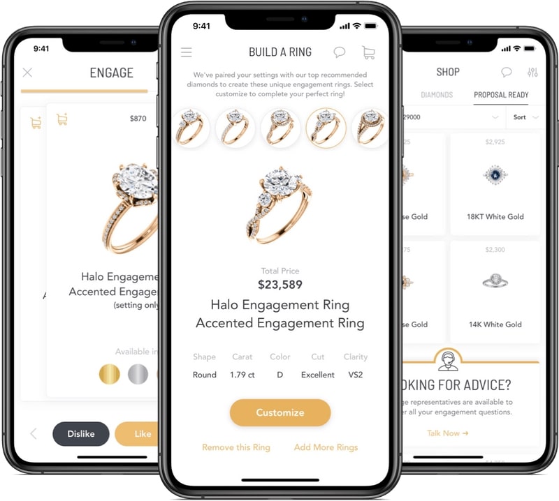 Using Artificial Intelligence (AI), Engage App saves favorites as the user goes through the design and search process, acting as a virtual consultant. Users can even connect to their Pinterest account, allowing the App to develop smart recommendations for the buyer, showcasing ring band, and diamond options to match the profile imported from the App. To take it one step further, the App also captures the user’s preferences for price, style, shape, metal-type & more using familiar swipe-style UX, similar to the swiping mechanism of Apps like Tinder, Bumble, Instagram and Rent The Runway. One additional key differentiator to the Engage App, is that pricing is always adjusted to be competitive in the marketplace, without the need for price comparison shopping, as real-time market data is built into the App’s algorithm.
