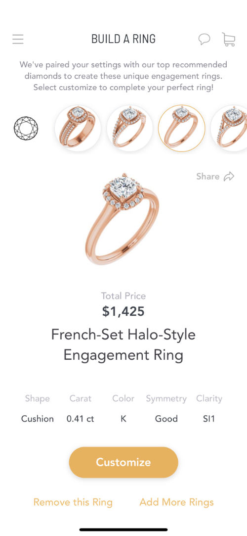 The App uses computer vision technology to develop smart recommendations to the buyer showcasing rings and diamonds matching the profile from the App. Using the Swipe-Style UX, the App can further identify patterns via machine learning to continually re-order the inventory displayed in the app-flow based on what the user likes and dislikes from the feed of over 100,000 diamonds. Users can then take a picture of their hand via the AI Try-On Feature to see the ring they’ve built mapped on their finger and share the virtual ring image on their hand with a partner via social, text, or email.