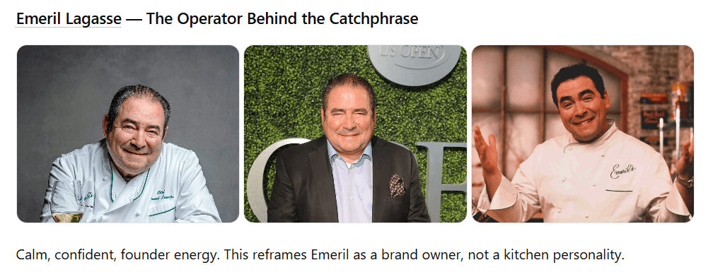 Few celebrity chefs have created comparable linguistic assets. Gordon Ramsay’s profanity can’t be trademarked. Guy Fieri’s enthusiasm resists distillation into single phrases. Emeril’s “BAM!” achieved something rare: a verbal logo with independent commercial value.