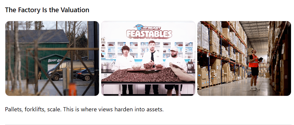 The math doesn’t work if you view YouTube as the business. It works perfectly if you view YouTube as marketing expense for Feastables, merchandise, and future ventures. Donaldson has said explicitly that he loses money on content. He’s buying attention at scale and converting it to product sales elsewhere.
