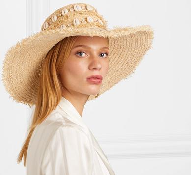 Stay shaded in style with the Aquazzura ‘Riveriera’ hat embellished with shells and crystals. Available at Net-A-Porter.com, $395.