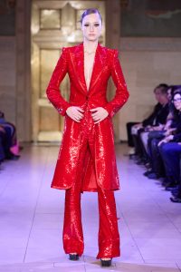 Set against Art Deco grandeur, the coed collection draws on the visual language of late 1920s and 1930s glamour and classic film noir, pairing refinement with an undercurrent of tension and consequence. Breton, trained on Savile Row and recognized for work spanning fashion, film and music, approaches the season with silhouettes designed to feel deliberate and sculpted, emphasizing a sense of character and narrative in each look.