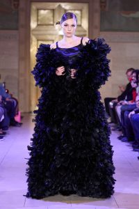 A nocturnal palette anchors the collection, including inkwell black, bone white, champagne gold, garnet and smoke silverreinforces the cinematic atmosphere, with beauty by Odilis and hair by Vivienne Mackinder leaning into polished, era inspiring glamour.