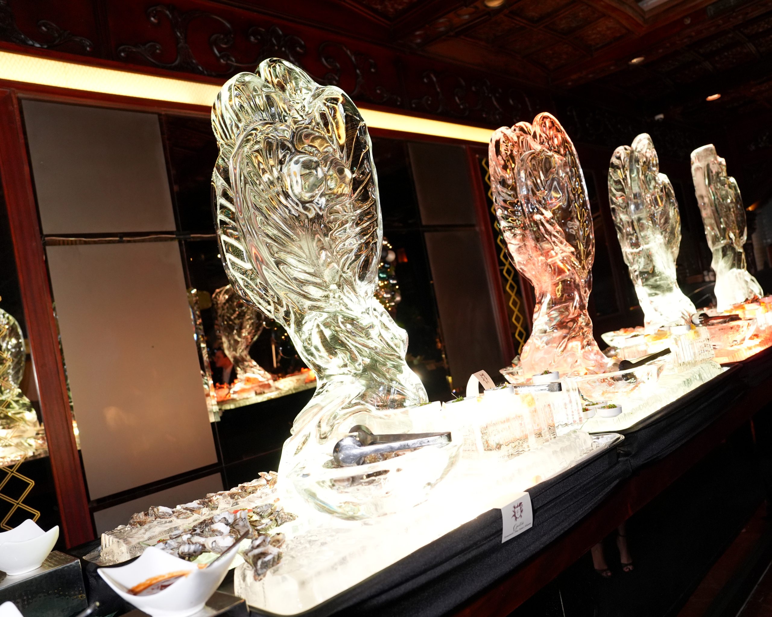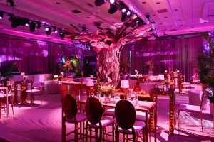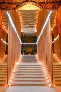 Guests arriving at the historic oceanfront property were greeted by an outdoor performance by the Earth Harp – a string instrument suspended across the entrance to the hotel with imagery matching the performance projected onto the hotel building. A lavish cocktail reception set against the hotel’s iconic lobby saw intricate ice sculptures and 35 musicians from the Philharmonic Orchestra of Puerto Rico who played familiar compositions with a Latin twist. The couple requested an “unplugged” experience to encourage guests to fully engage with and enjoy the festivities.