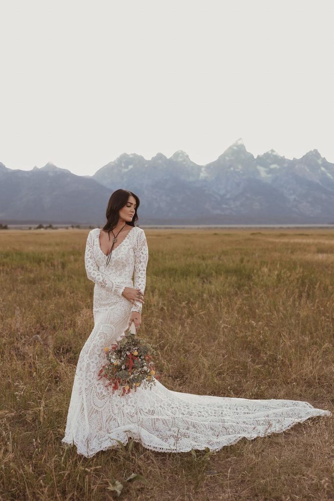 The Josephine is their bestseller, and it’s easy to see why. It’s a long sleeve lace wedding dress with a dramatic train and plunging neckline — features that would typically mean restriction and discomfort in conventional bridal construction. But the cotton lace and art deco-inspired geometric pattern make the sleeves feel like a second skin, not a cage. The result is a dress that delivers the romance and drama of vintage European couture while actually allowing the bride to lift her arms, embrace her people, and move through her wedding day without counting the hours until she can change.