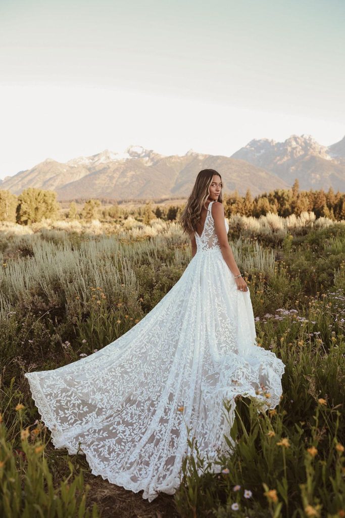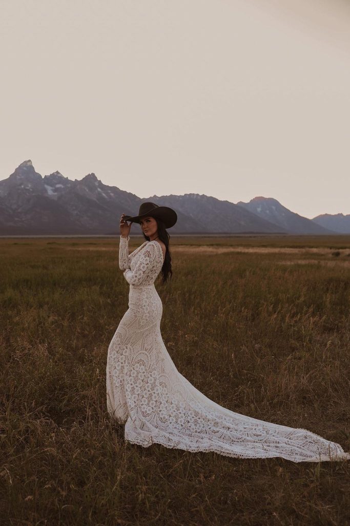 The Josephine is their bestseller, and it’s easy to see why. It’s a long sleeve lace wedding dress with a dramatic train and plunging neckline — features that would typically mean restriction and discomfort in conventional bridal construction. But the cotton lace and art deco-inspired geometric pattern make the sleeves feel like a second skin, not a cage. The result is a dress that delivers the romance and drama of vintage European couture while actually allowing the bride to lift her arms, embrace her people, and move through her wedding day without counting the hours until she can change.