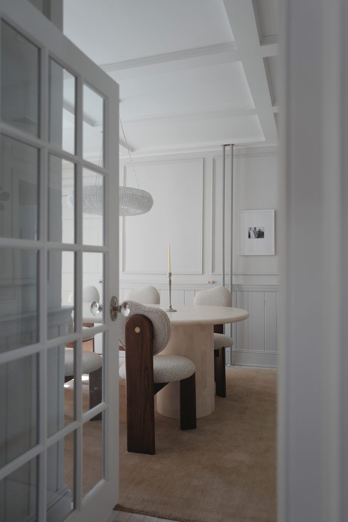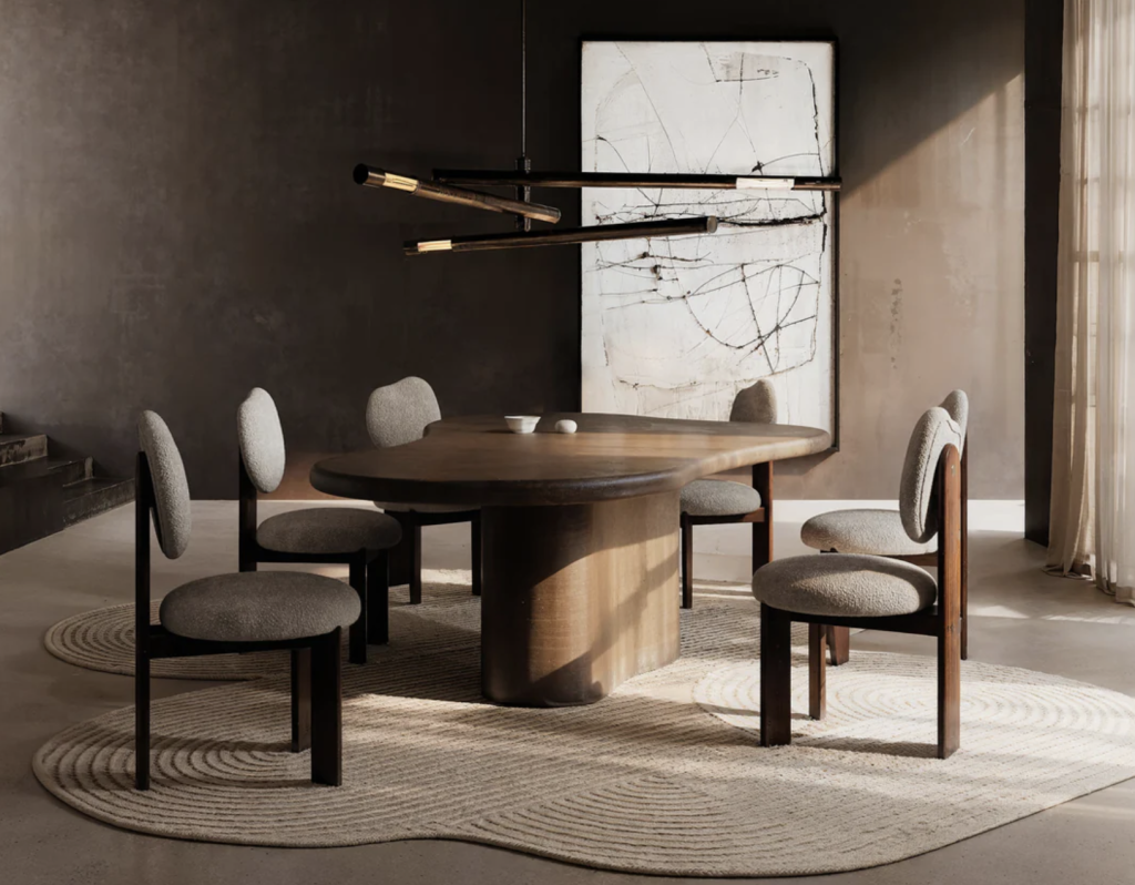 What makes the Etang particularly compelling is its versatility. It doesn’t dictate the room; it adapts to it. Around a raw wood table, it leans organic. Paired with polished stone or glass, it becomes more refined, almost gallery-like.
