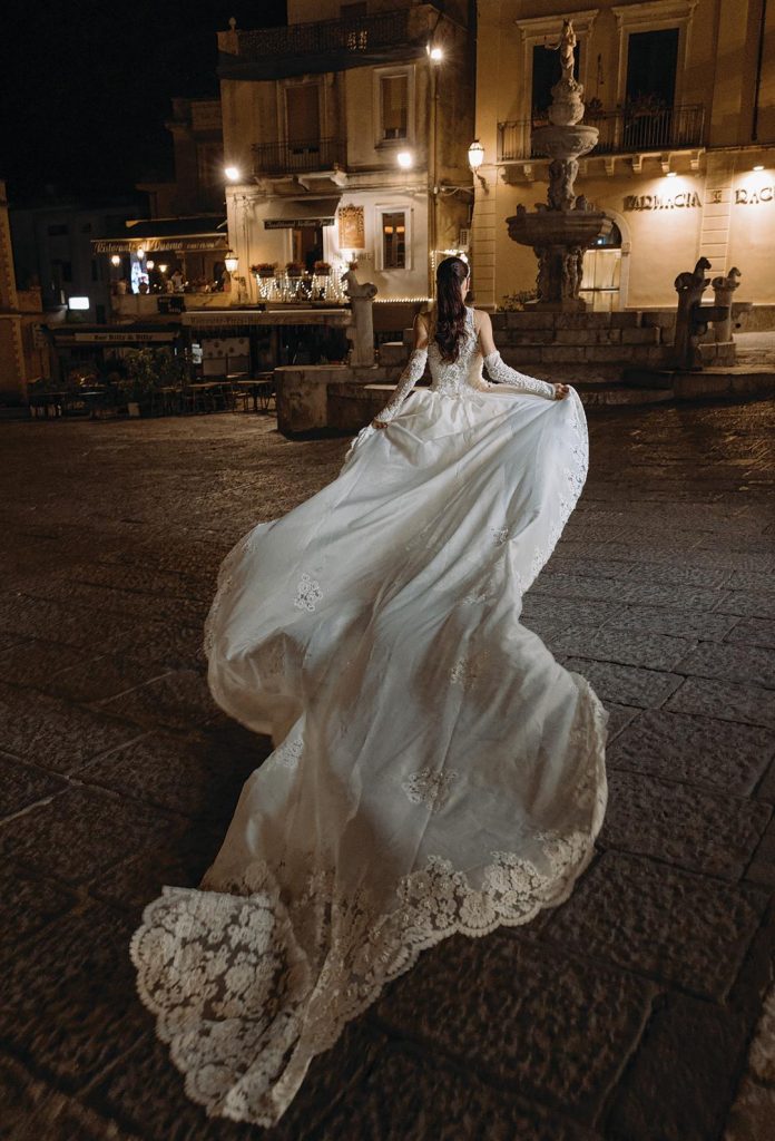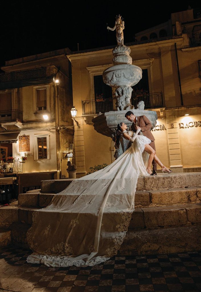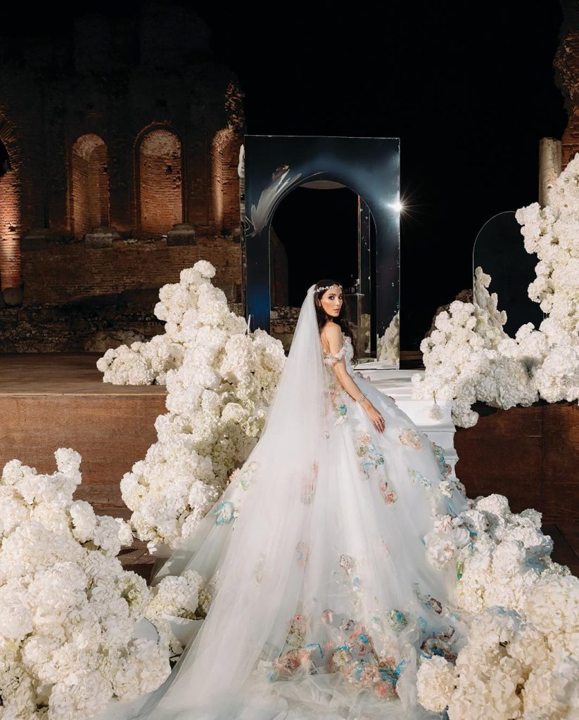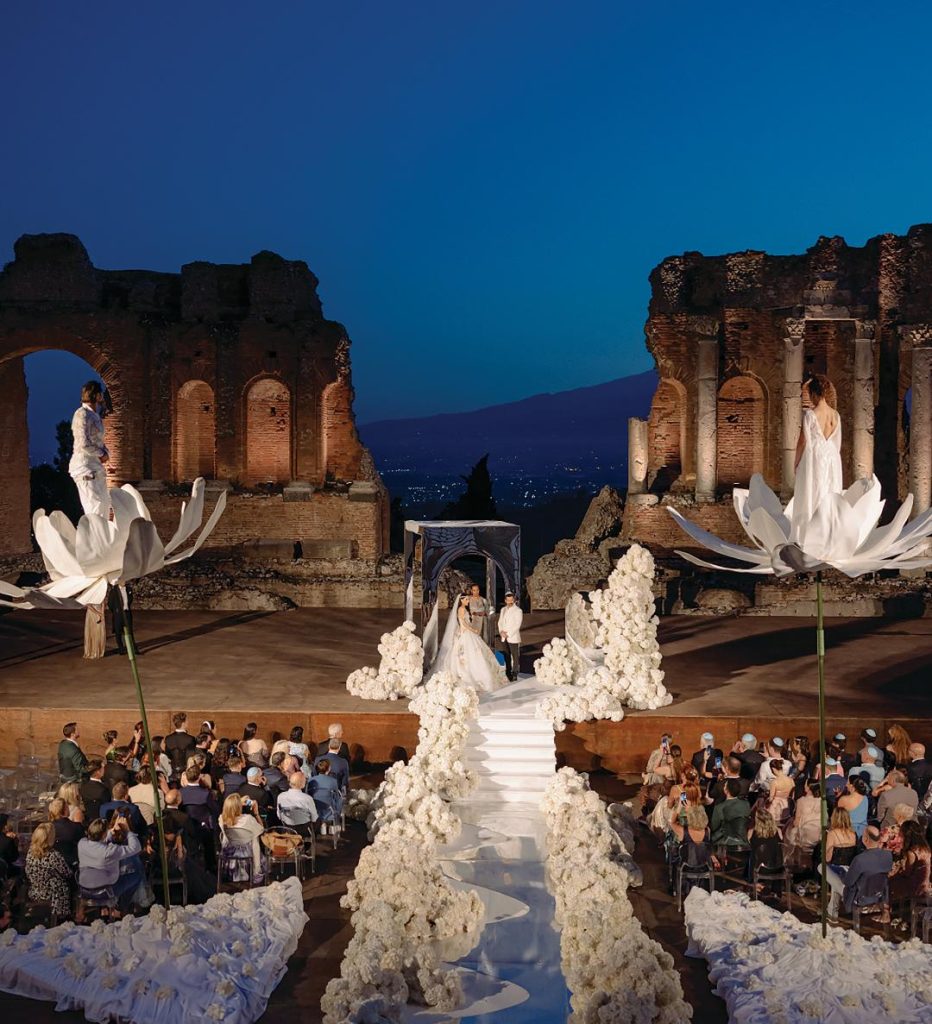 The wedding itself unfolded at Taormina’s ancient Greek theatre, with Mount Etna erupting in the distance as though nature itself wanted to bear witness.